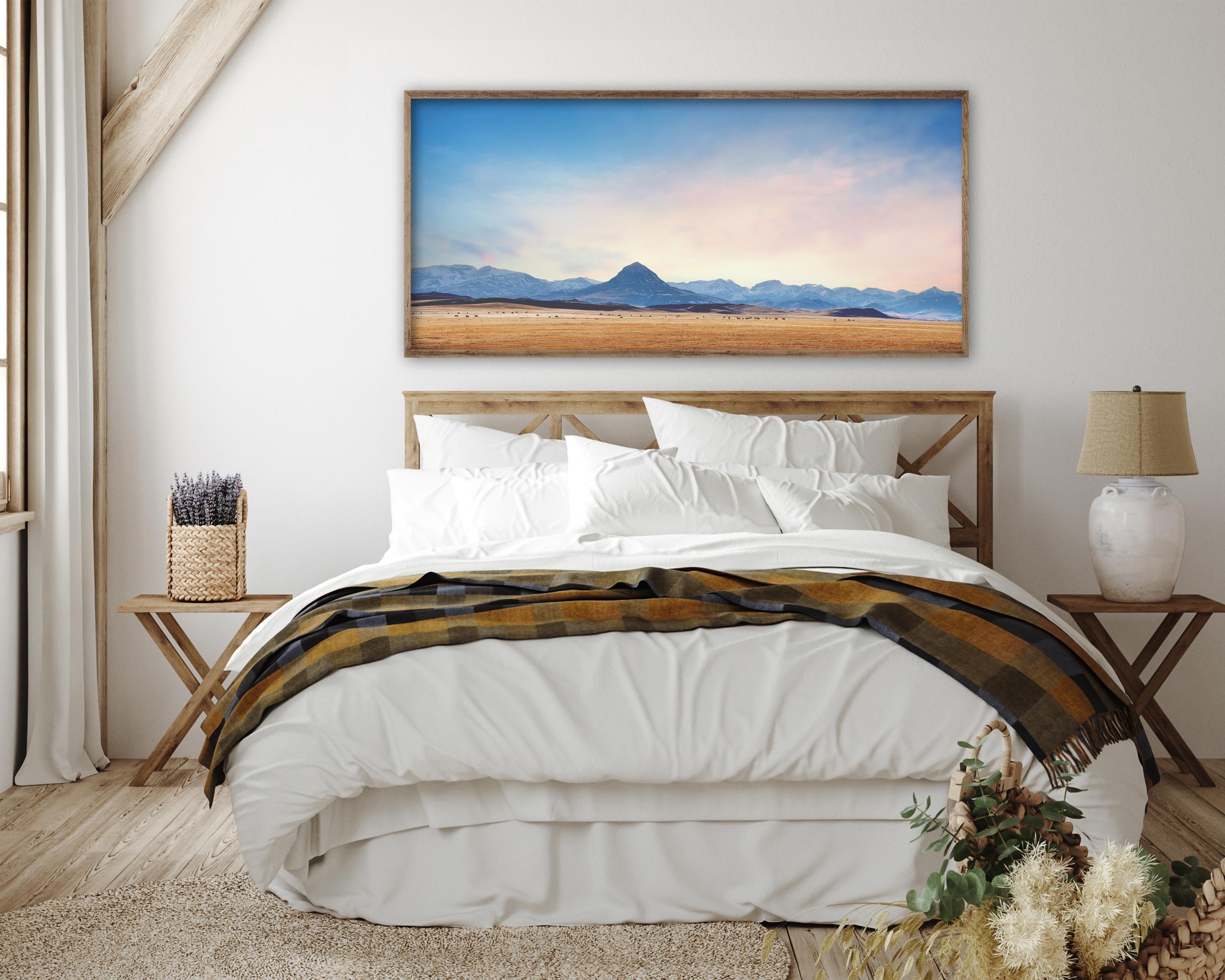 This panoramic photograph is made using several images stitched together to create one beautiful image that allows for high-resolution printing at large sizes. Taken in the meadows overlooking the Rocky Mountains near the Candian border in Montana, the beautiful sky stretches out over the expansive mountain range. This area, in Northern Western Montana is known as the "Rocky Mountain Front" and borders the Bob Marshall Wilderness.