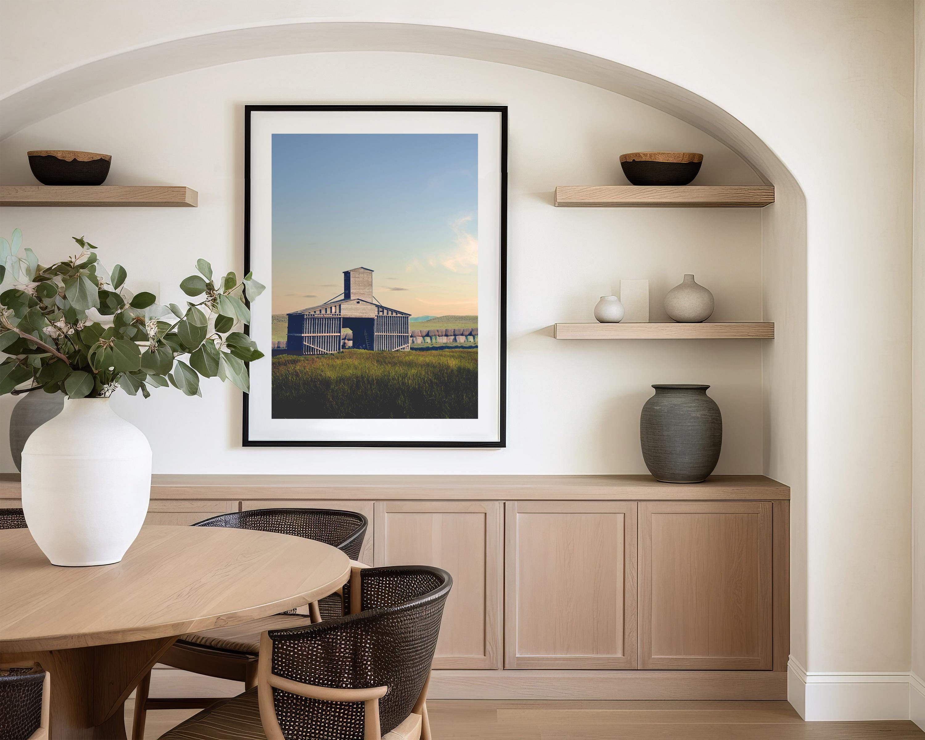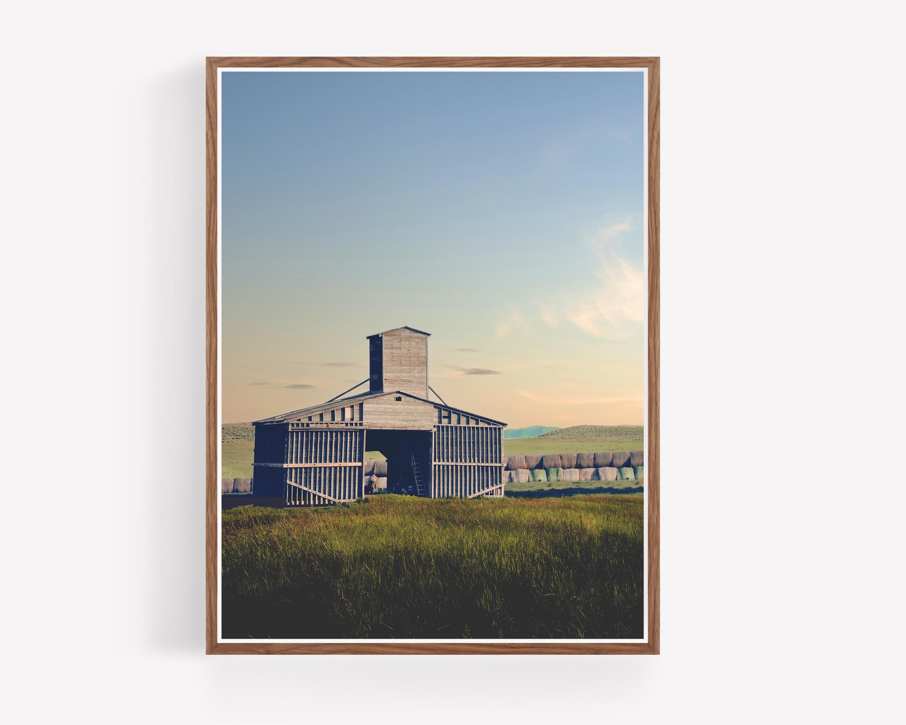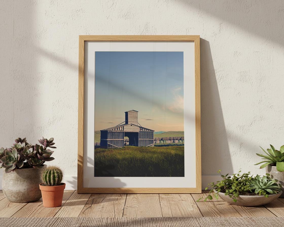 On a warm summer evening, I captured this weathered, silver-gray wooden barn standing as a solitary monument in a vast rural landscape. The structure is defined by its unique architectural silhouette, including a prominent central grain tower and vertical slats that show the wear of time. It sits amidst a field of tall, dark green and golden grasses, while a long row of hay bales stretches across the horizon in the background beneath rolling hills. The soft, warm light of a late afternoon or sky bathes the landscape in warm light. I love these summer sunsets, when the sky gradients from a pale blue at the top to a gentle peach glow near the horizon, creating a quiet and nostalgic atmosphere.