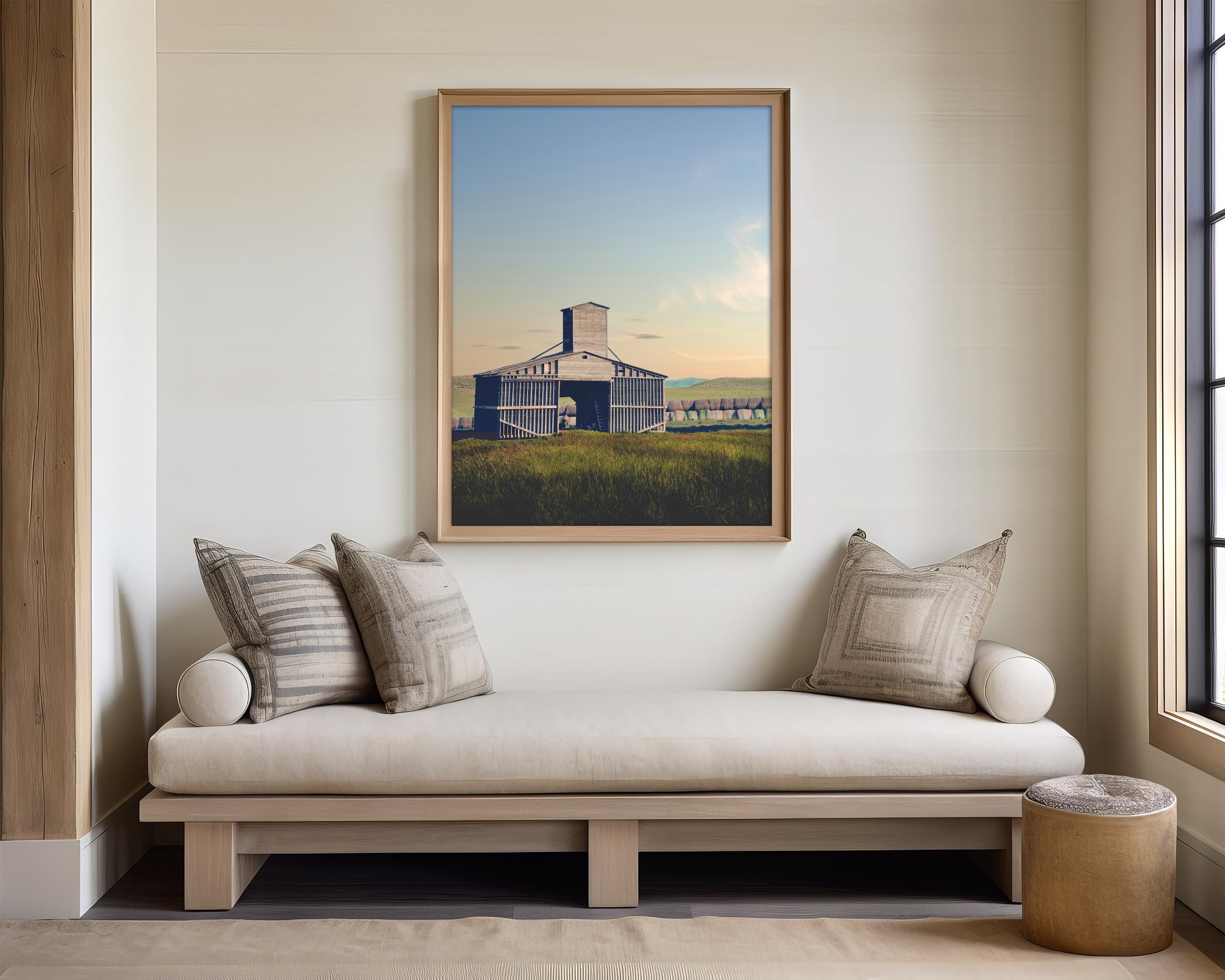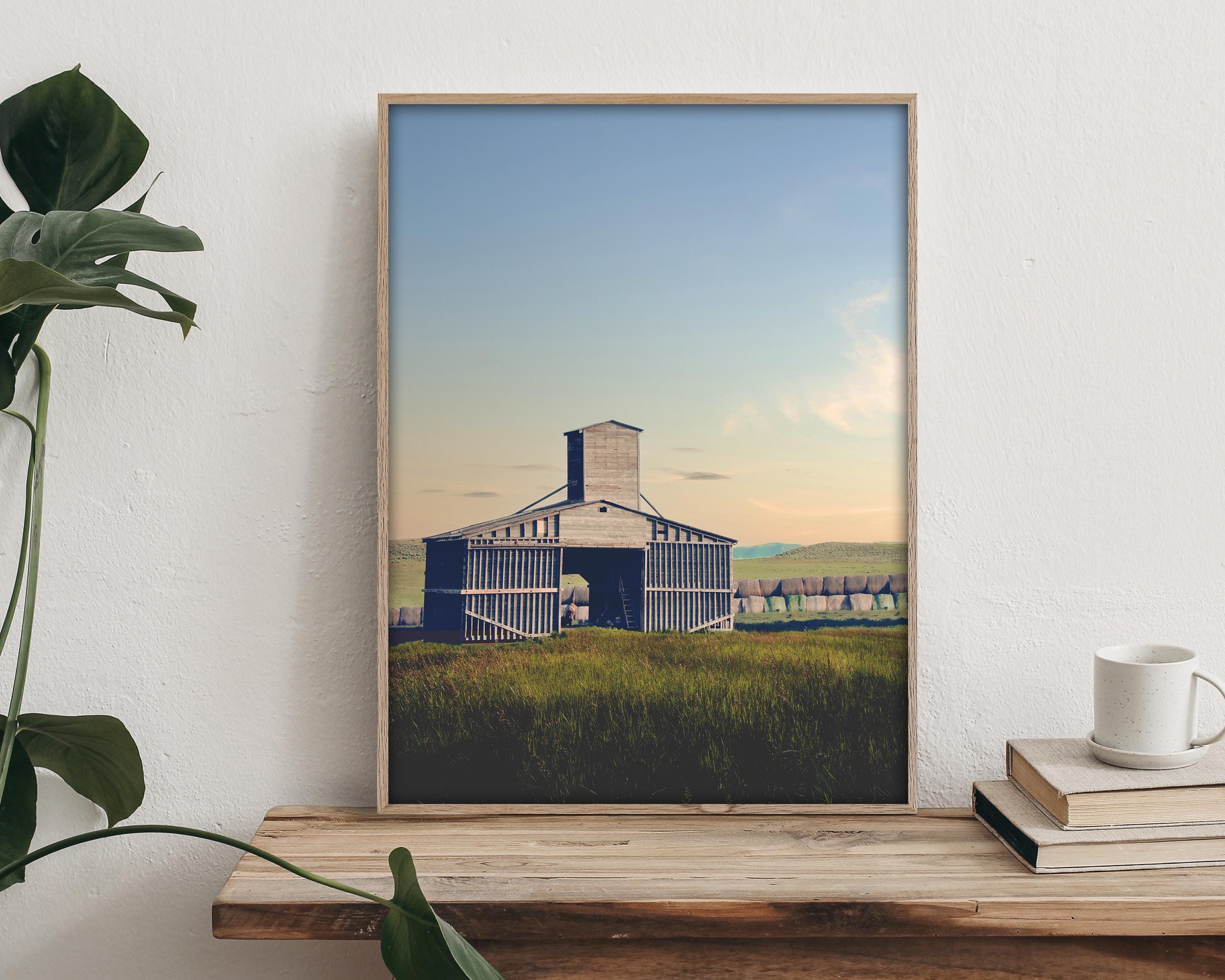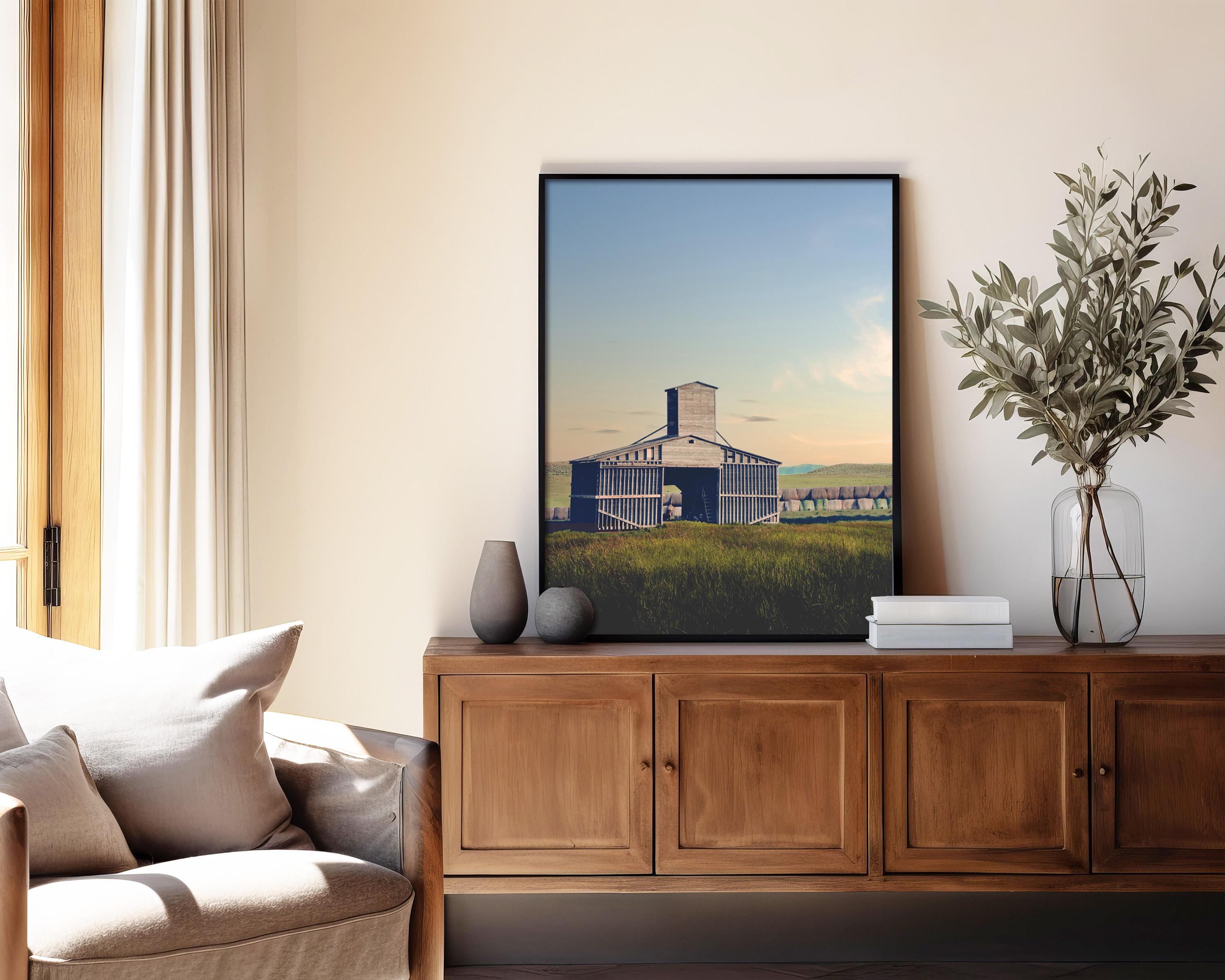 On a warm summer evening, I captured this weathered, silver-gray wooden barn standing as a solitary monument in a vast rural landscape. The structure is defined by its unique architectural silhouette, including a prominent central grain tower and vertical slats that show the wear of time. It sits amidst a field of tall, dark green and golden grasses, while a long row of hay bales stretches across the horizon in the background beneath rolling hills. The soft, warm light of a late afternoon or sky bathes the landscape in warm light. I love these summer sunsets, when the sky gradients from a pale blue at the top to a gentle peach glow near the horizon, creating a quiet and nostalgic atmosphere.