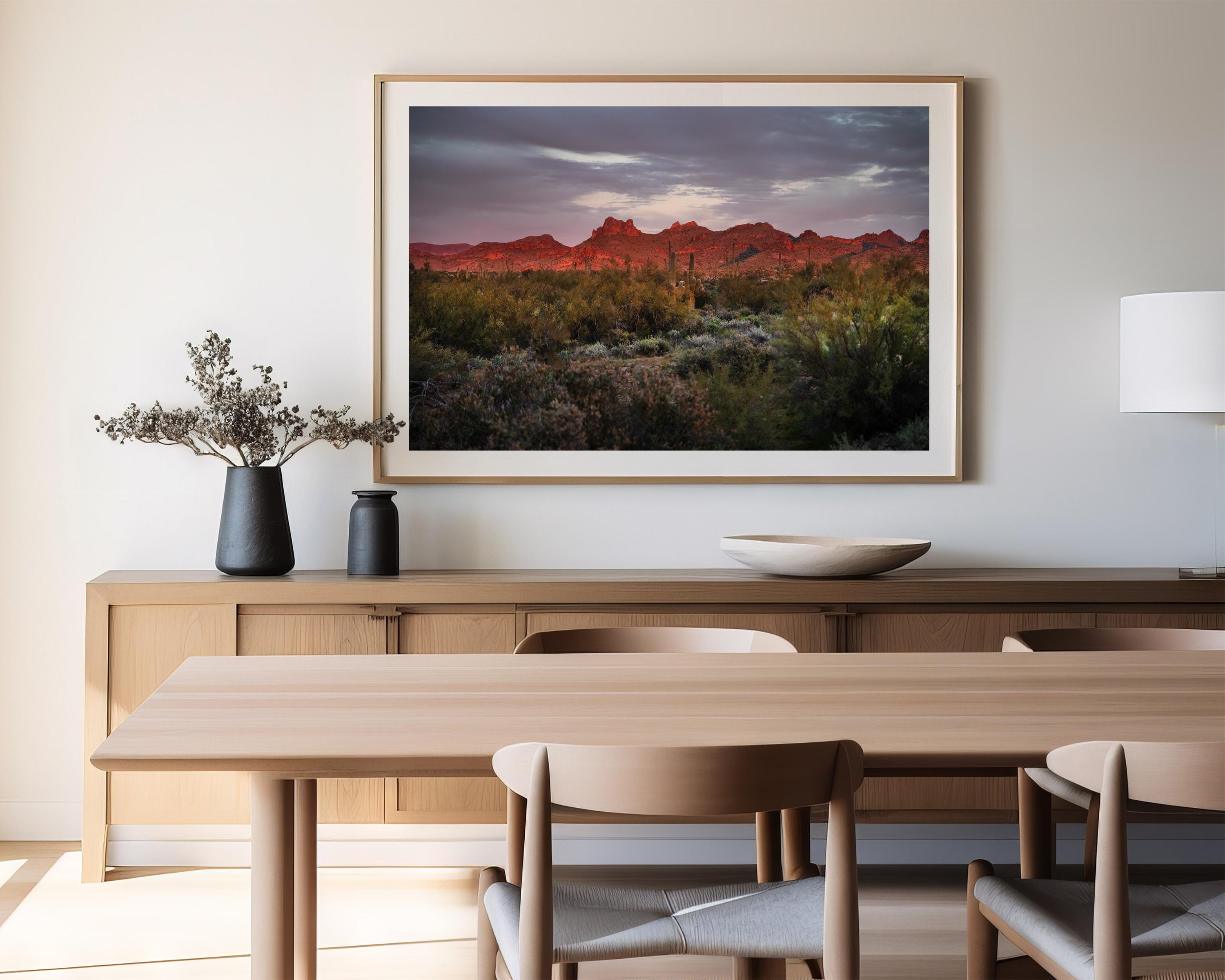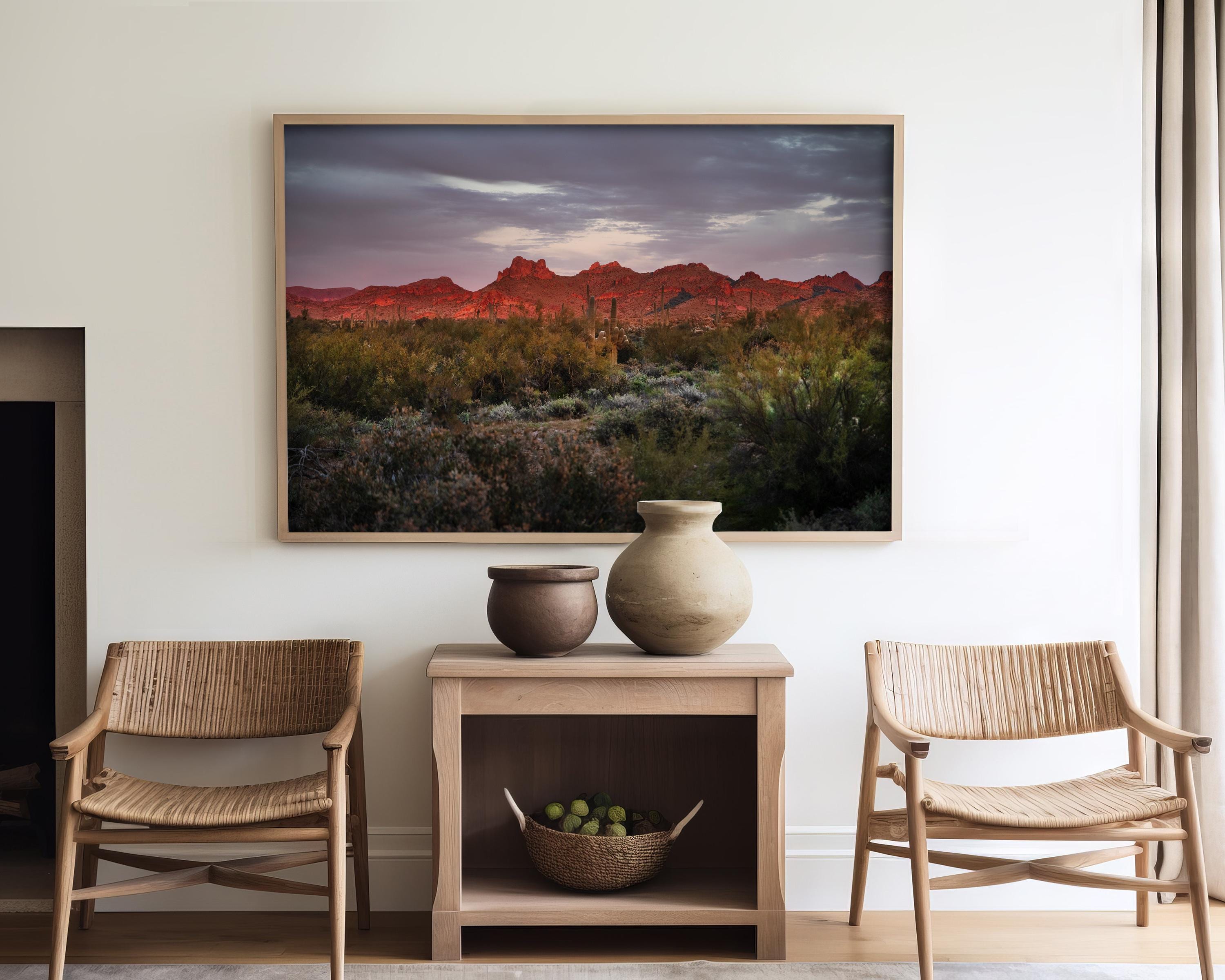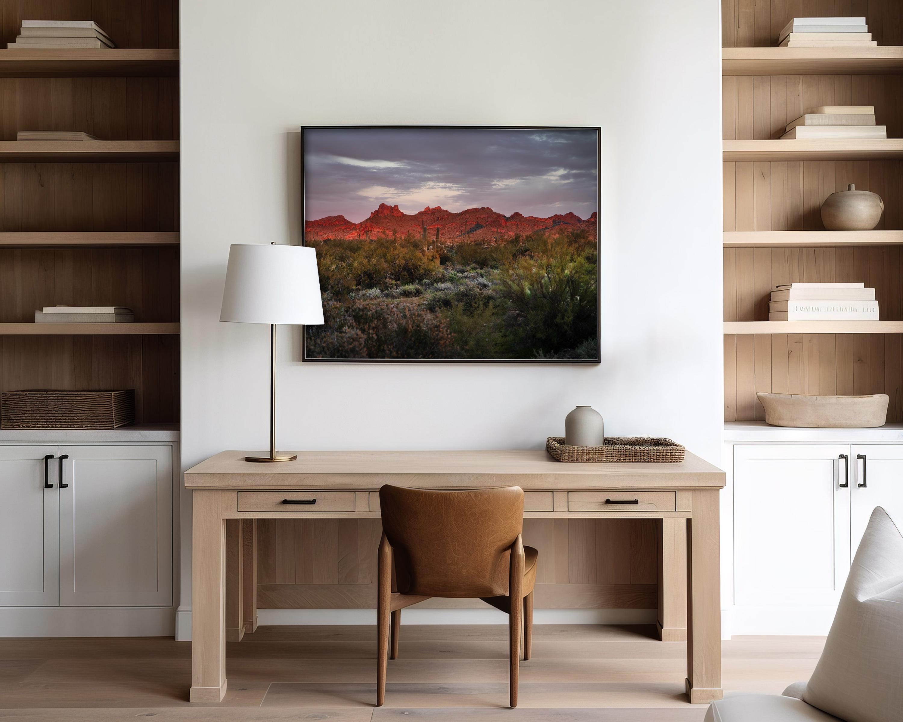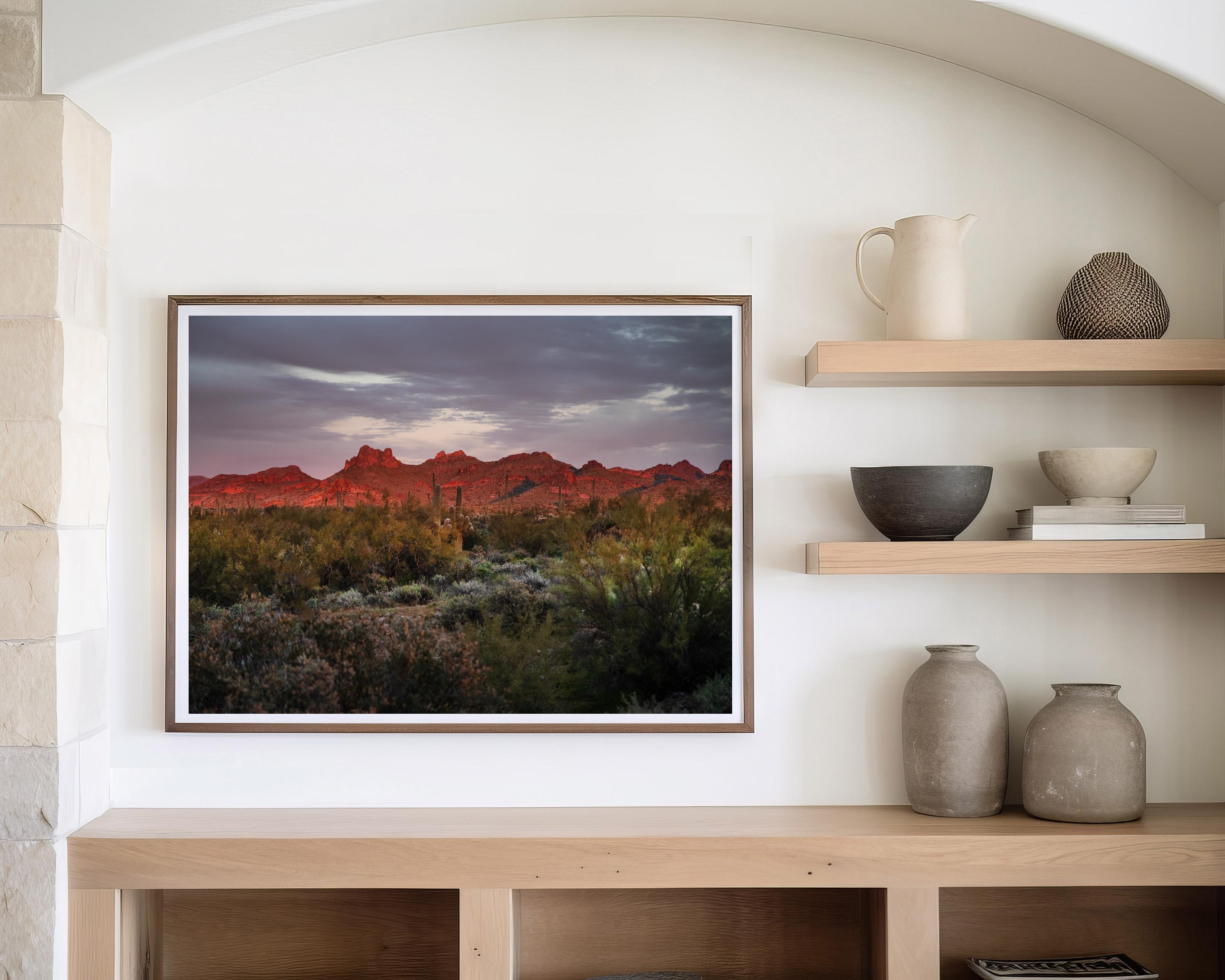 On my first trip to the desert, I was able to capture the fleeting bright colors of the landscape as the setting sun ignites the rugged ridgeline of the Superstition Mountains. Below the fiery peaks, the desert floor is transitioning into the cool shadows of twilight, where a dense thicket of sagebrush and creosote bushes creates a rich, textured foreground. Rising quietly from the brush, the silhouettes of Saguaro cacti stand as stoic sentinels against the deepening violet and charcoal tones of the evening sky. The composition beautifully balances the dramatic heat of the illuminated rock with the serene, moody atmosphere of the approaching night, perfectly encapsulating the vast and untamed spirit of the Southwest..