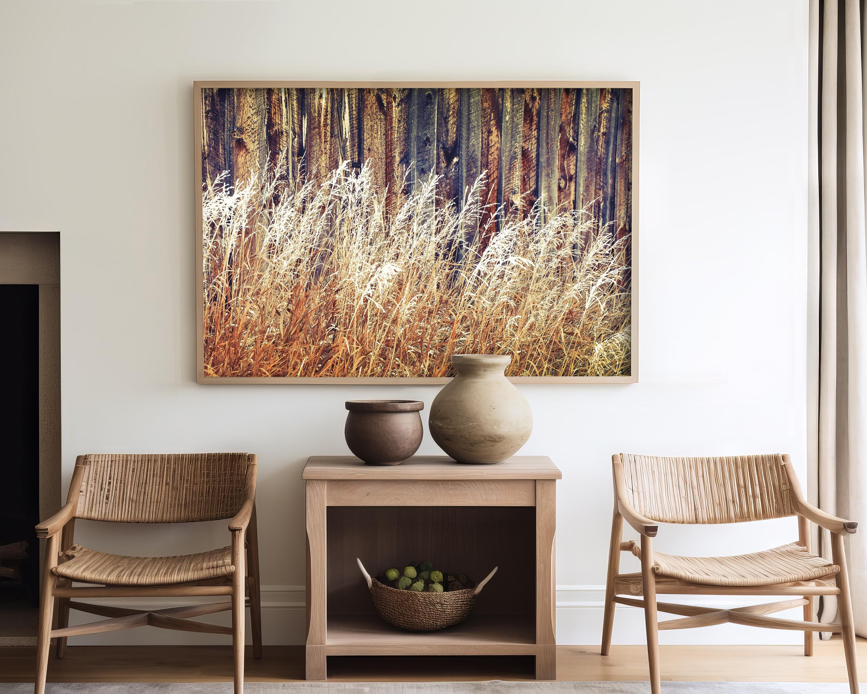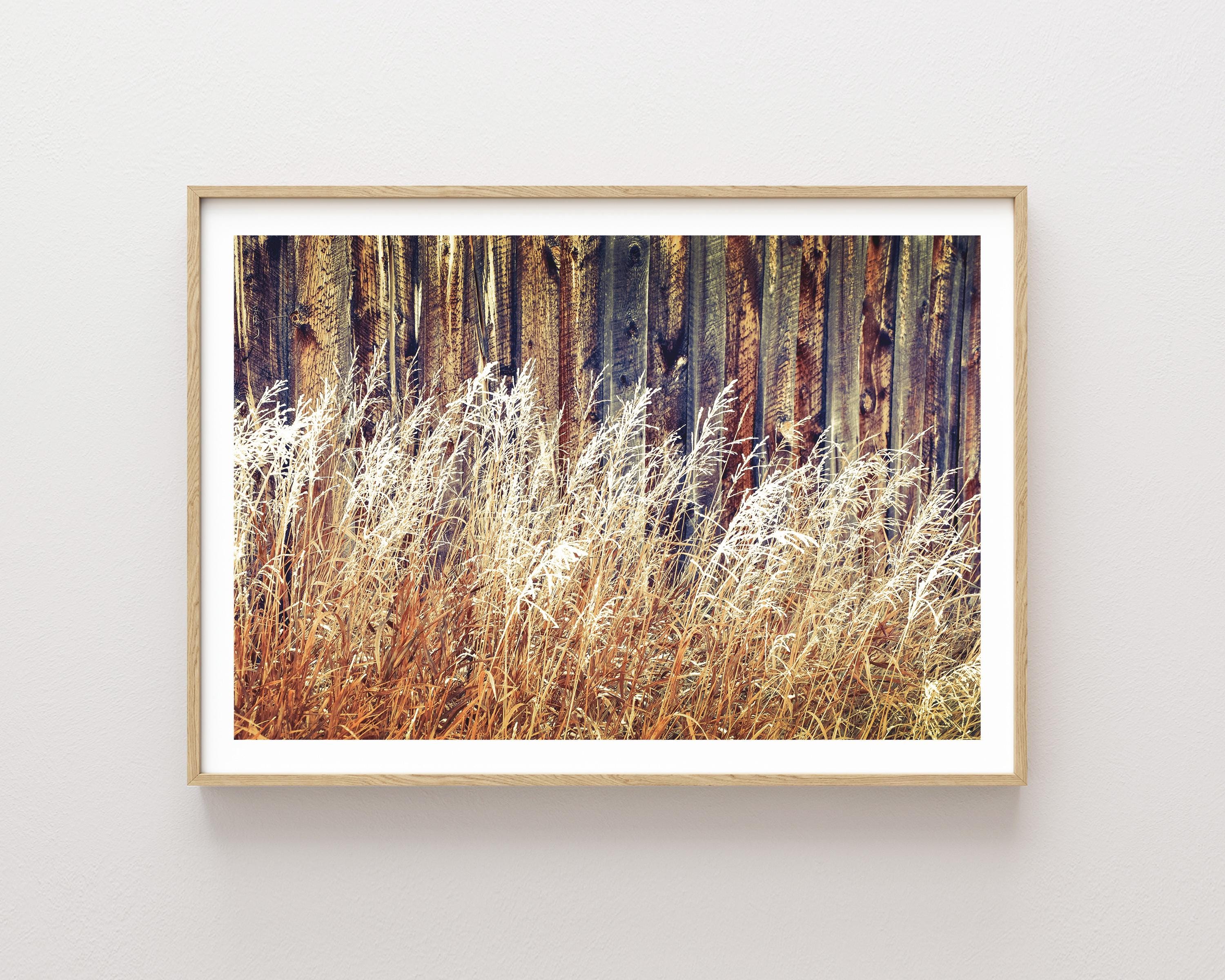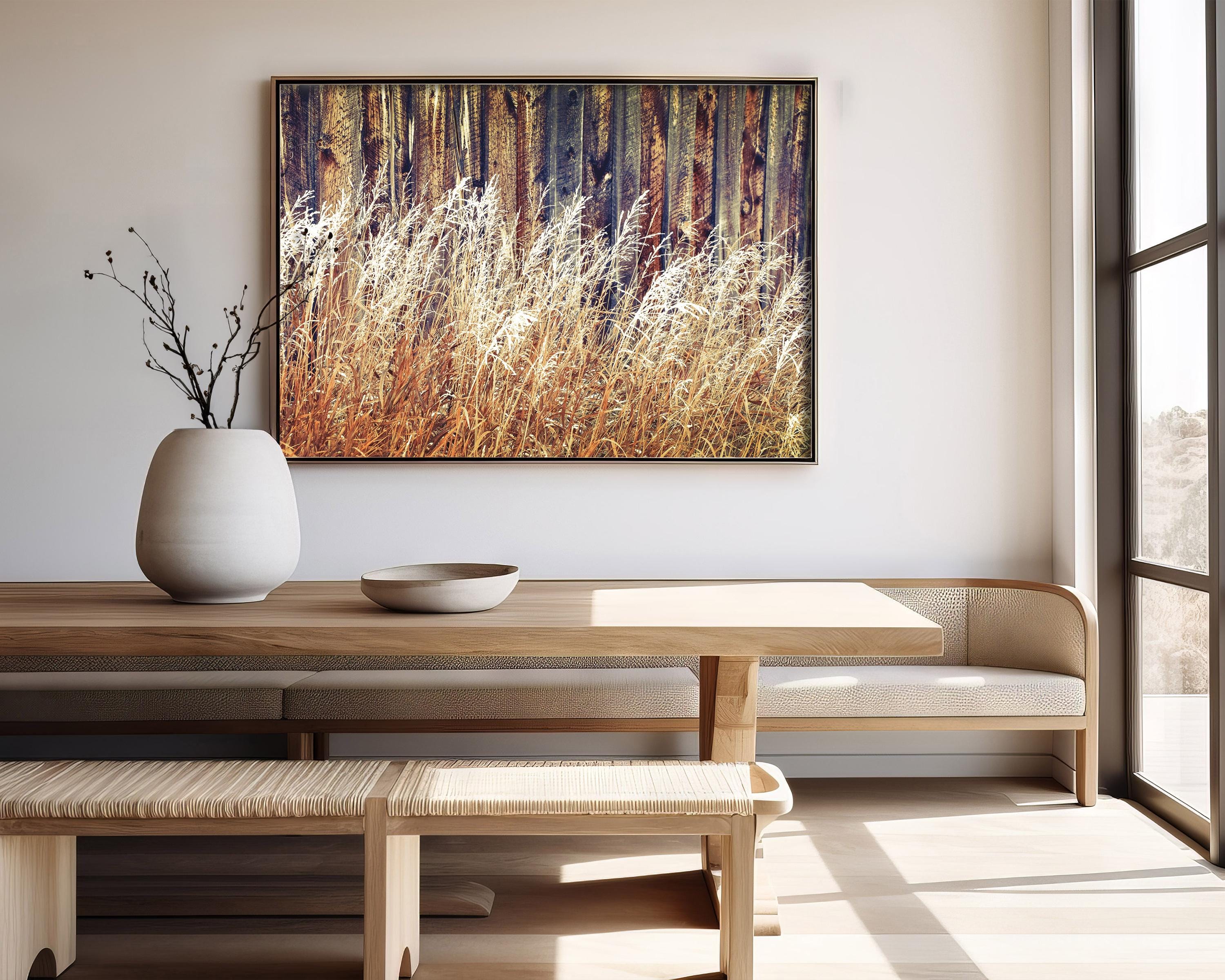 Bring the golden, sun-drenched textures of a Montana autumn into your decor with this minimalist study of wild prairie grasses against a weathered barn wood backdrop. I have always loved the neutral tones of the Fall season, rich oranges and soft yellows, as well as dark browns all mix together in the landscape to make a beautiful and calming palette that you can enjoy on your walls all year.