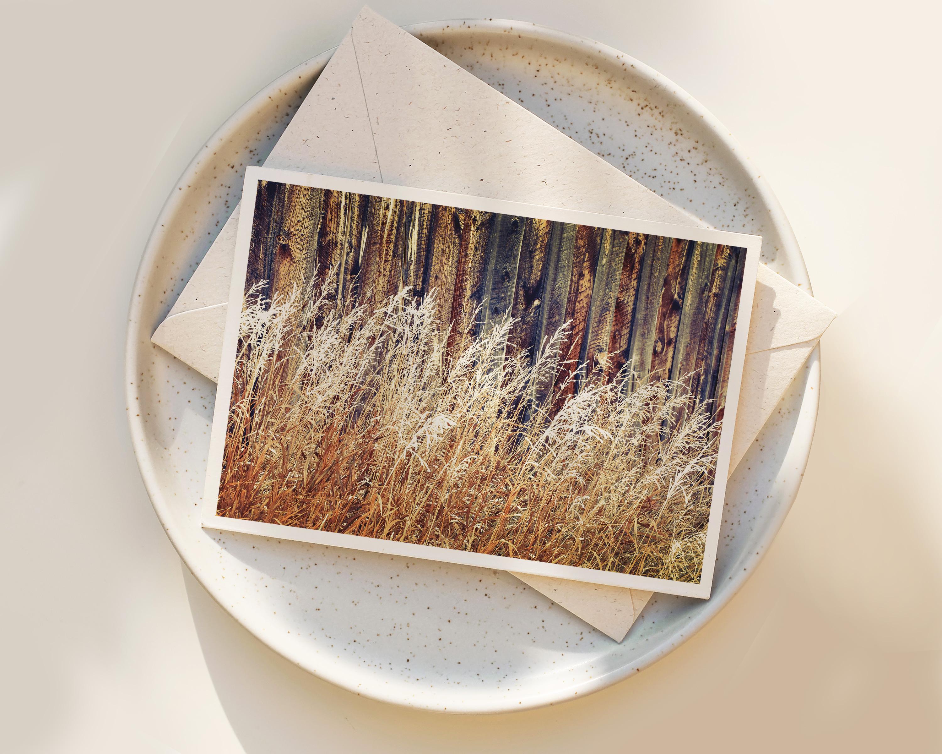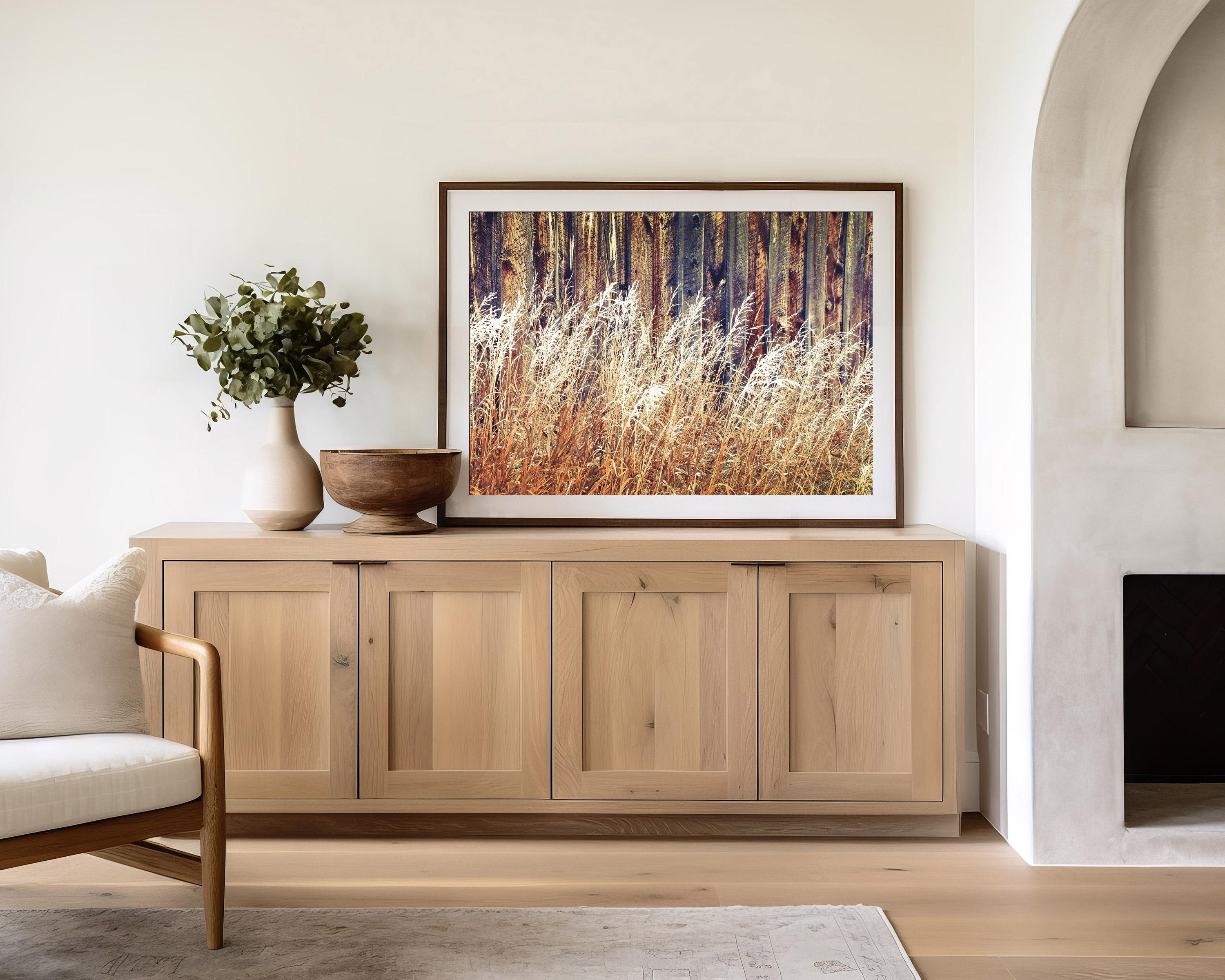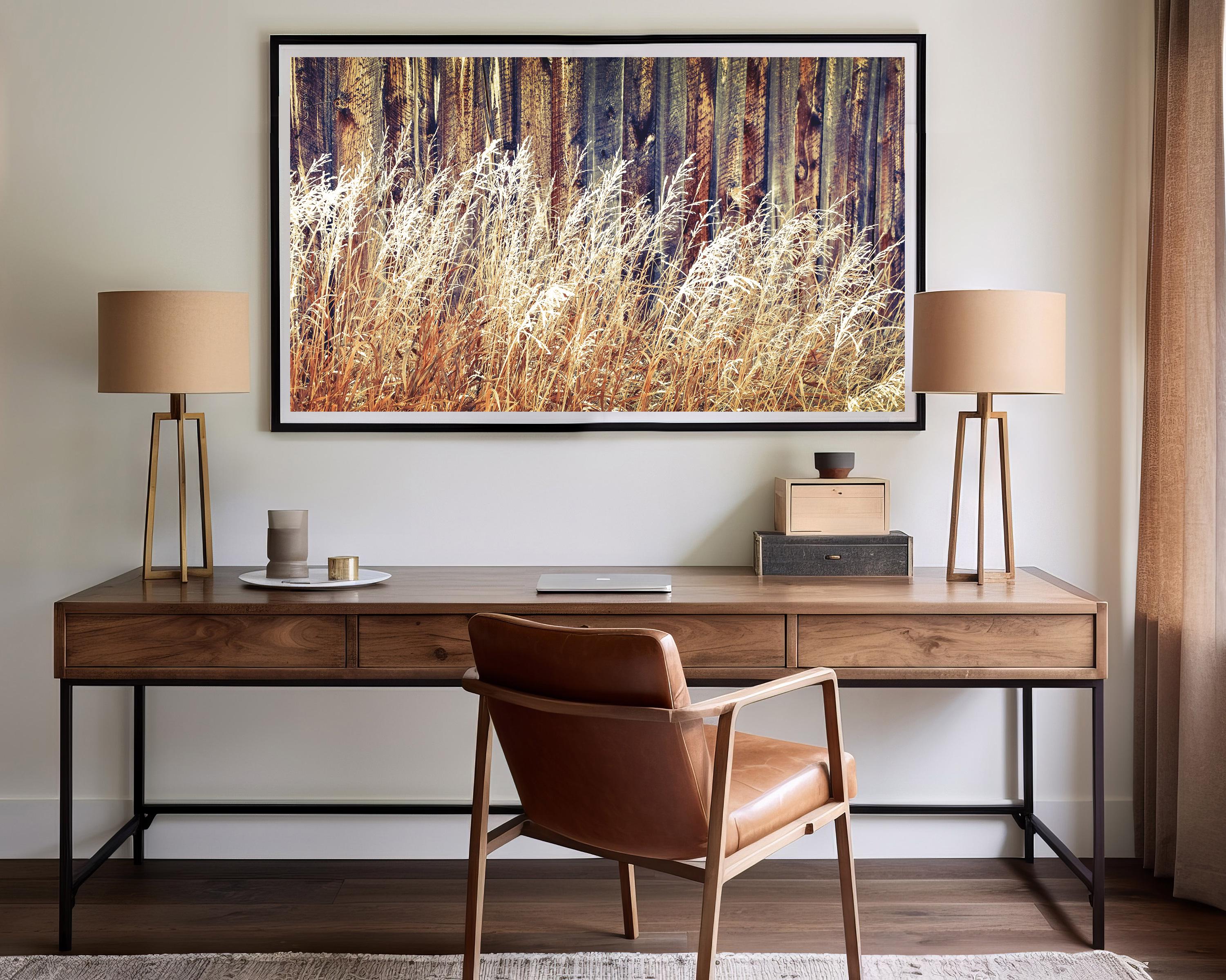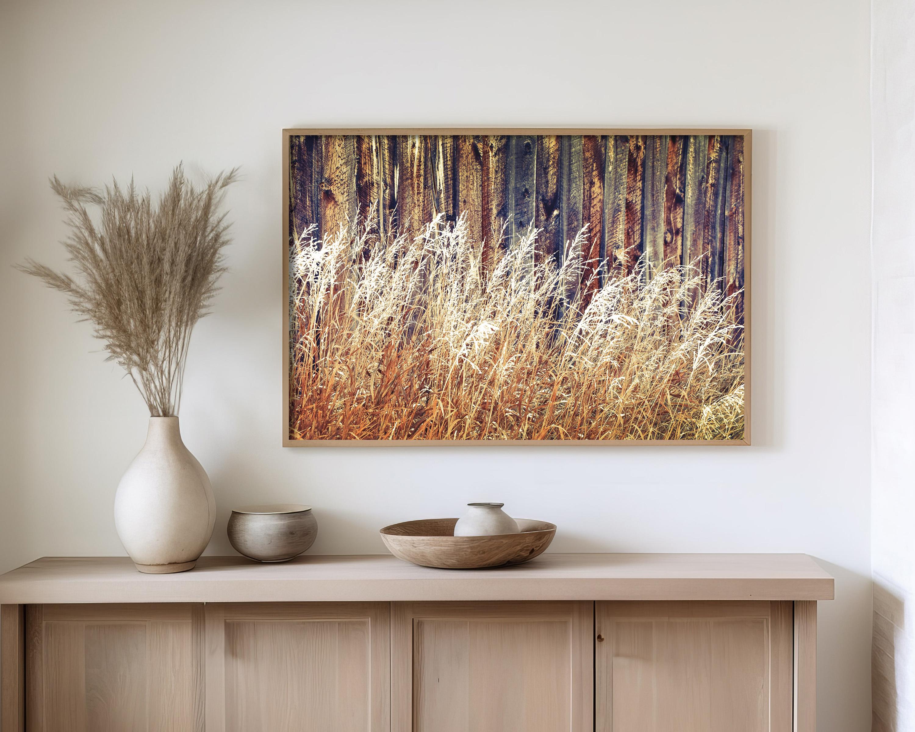 Bring the golden, sun-drenched textures of a Montana autumn into your decor with this minimalist study of wild prairie grasses against a weathered barn wood backdrop. I have always loved the neutral tones of the Fall season, rich oranges and soft yellows, as well as dark browns all mix together in the landscape to make a beautiful and calming palette that you can enjoy on your walls all year.