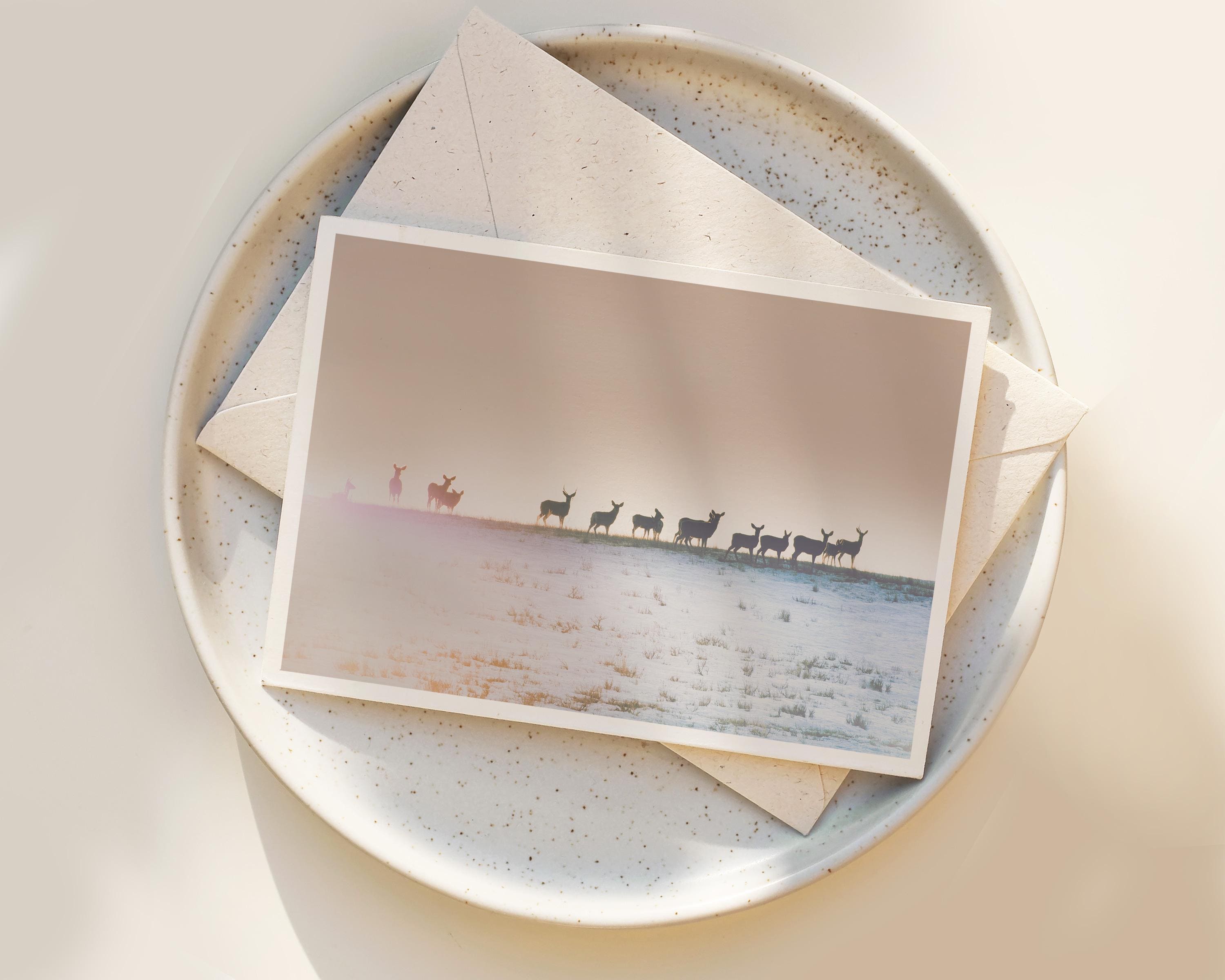 A herd of mule deer stand in the warm light of the setting sun, as the cross the crest of a snowy hill in Montana. I love these small quiet moments in the countryside, where the slowness of the American West soothes the soul. In this cold morning, these Mule deer are the only ones making any noise, as they stroll through the frosty landscape.