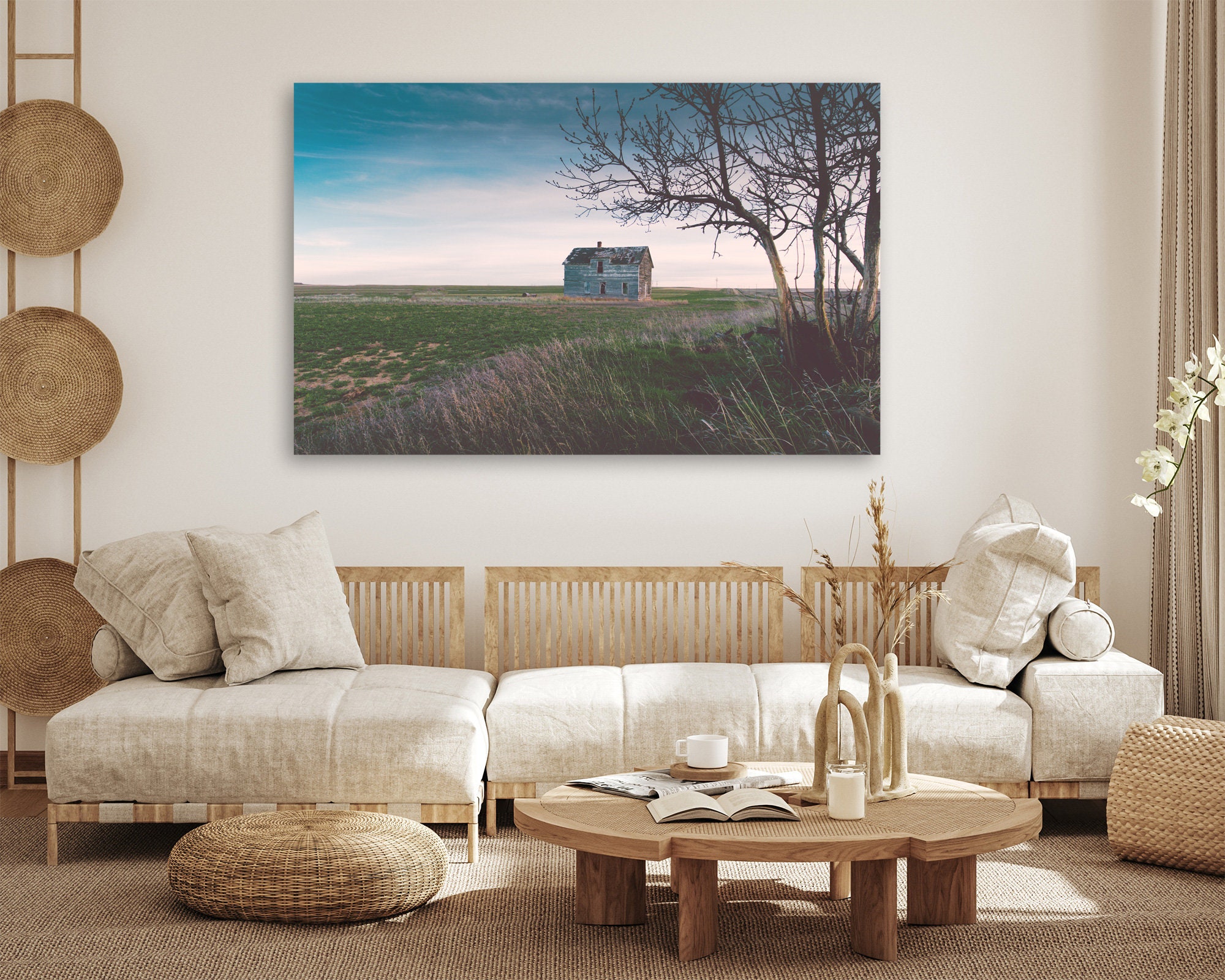 All is quiet and serene looking out over the beautiful colors of a summer sunset surrounding an abandoned farmhouse in the countryside of central Montana.