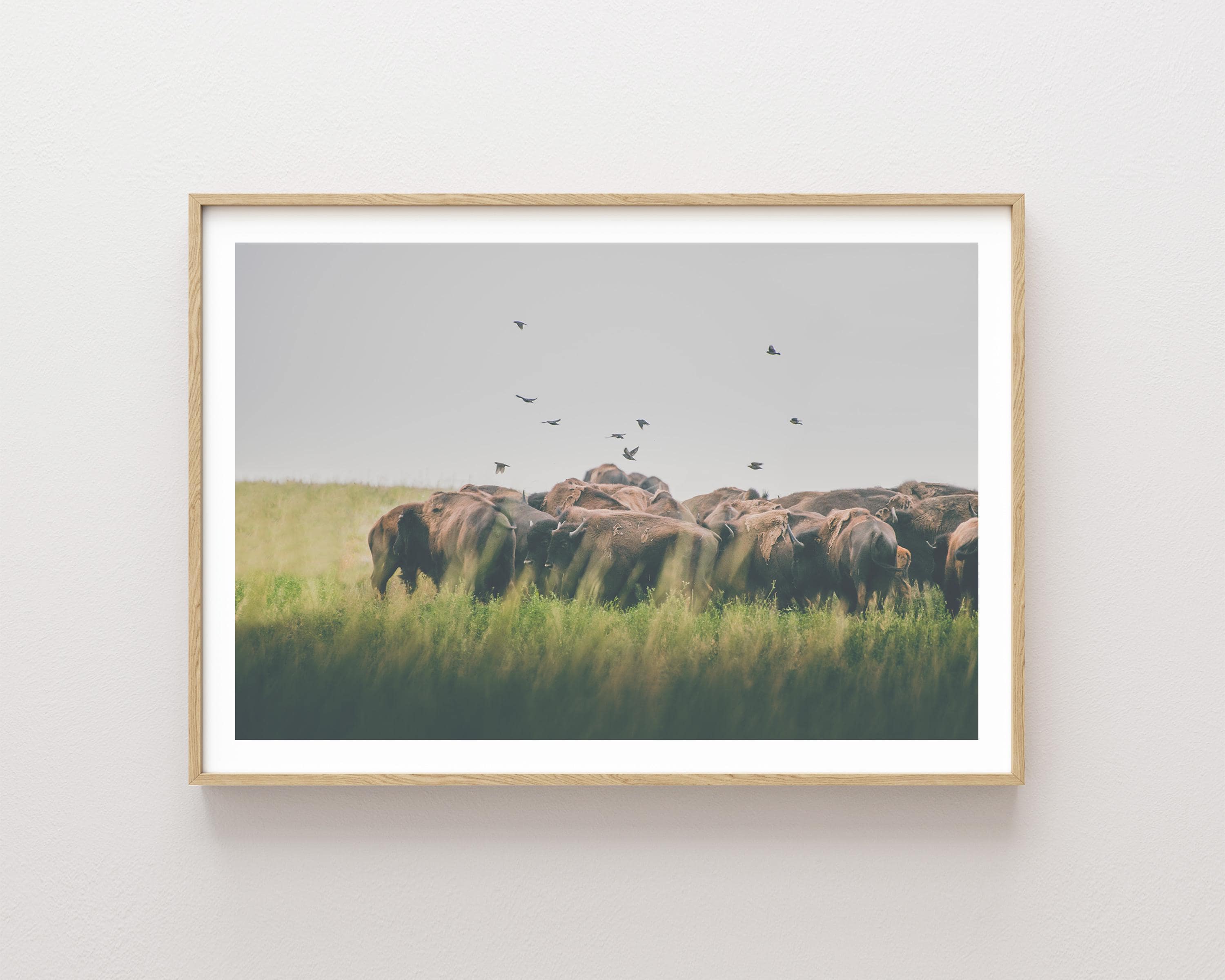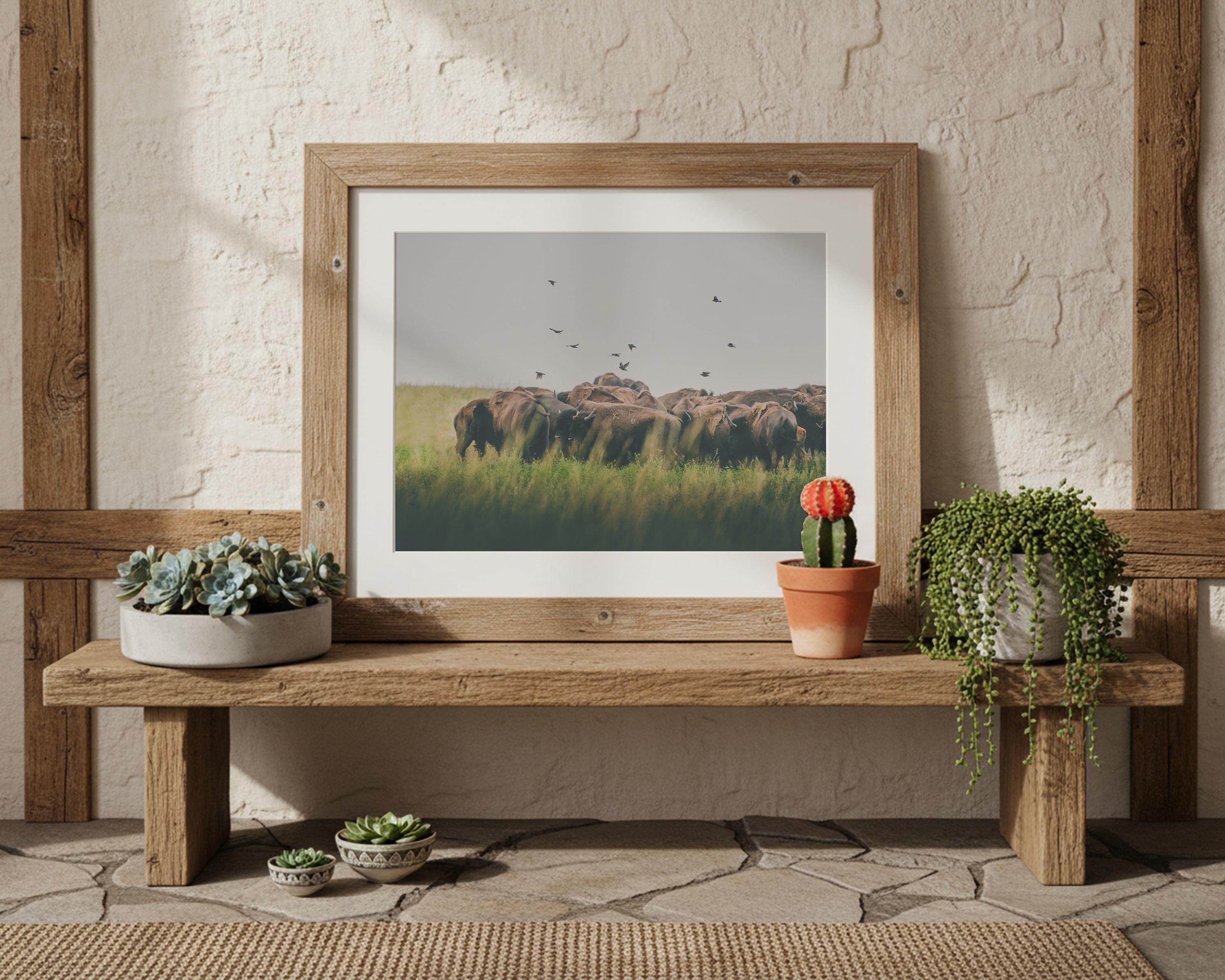 A flock of birds flies above a herd of Bison, grazing in a meadow of tall grass in central Montana.
